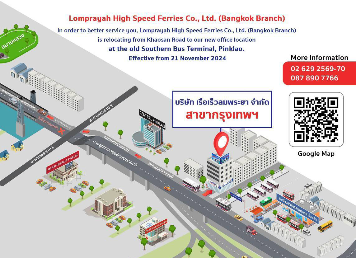 Lomprayah High Speed Ferries Co., Ltd. (Bangkok Branch, Old Southern Bus Station Pinklao) 147/1-147/2 Boromratchonnanee Road, Arun Amarin Subdistrict, Bang Khun Non District, Bangkok 10700