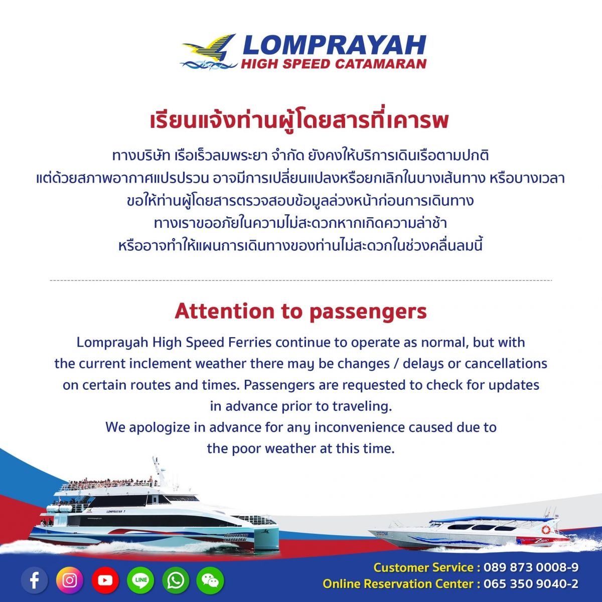Dear passengers, Lomprayah High Speed Ferries Co., Ltd. is still operating as usual. However, due to unstable weather conditions, there may be changes or cancellations on some routes or at some times. Passengers are requested to check the information in advance before traveling. We apologize for any inconvenience caused by delays or disruptions to your travel plans during this period of rough weather.