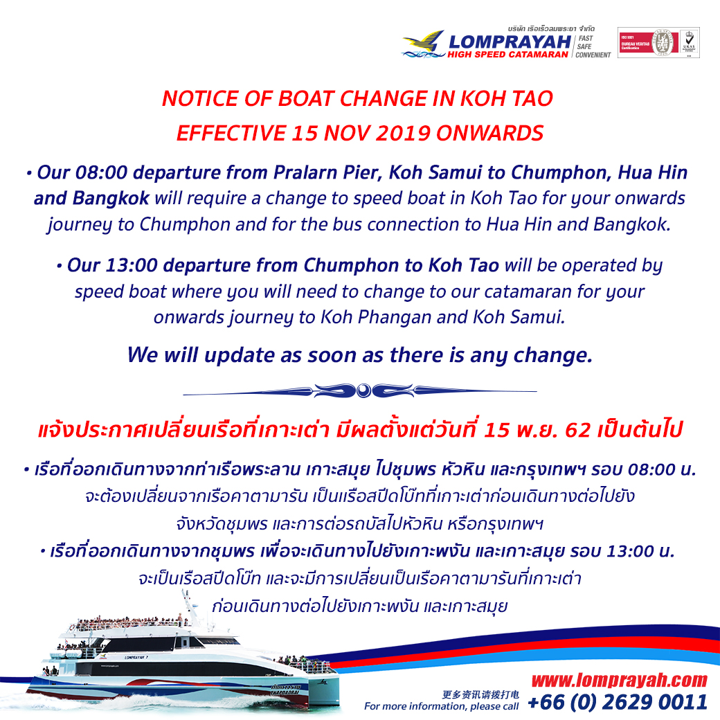 Notice of boat change in Koh Tao, effective 15 Nov 2019 onwards.