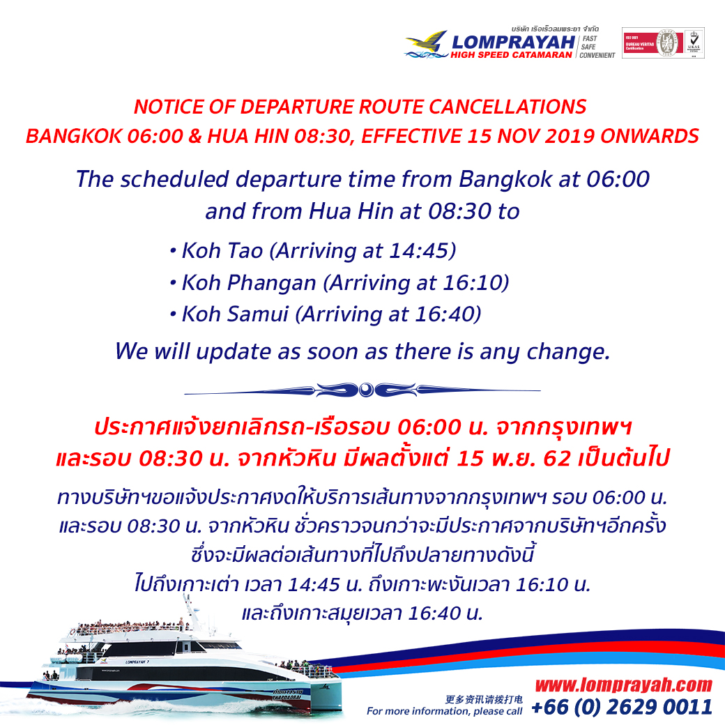 Bangkok 06:00 & Hua Hin 08:30, Effective 15 NOV 2019 onwards.