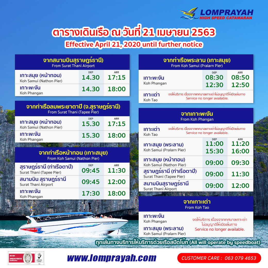 Due to a ruling by the local government, all services to and from Koh Tao will be suspended with immediate effect from Tuesday, 21 April 2020 until further notice. We will advise immediately upon receipt of information that service may resume.