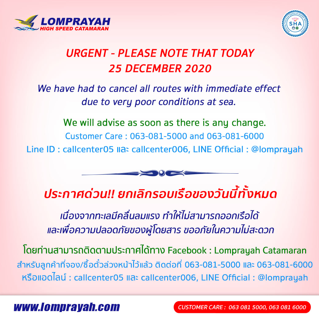 ประกาศด่วน!! ยกเลิกรอบเรือของวันที่ 25 ธันวาคม 2563 ทั้งหมด