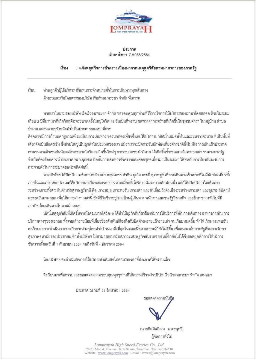จนมาถึงที่สุดในขณะนี้สถานการณ์ยังไม่ดีขึ้น เพื่อสนองนโยบายรัฐเรื่องการรักษาสุขภาพอนามัยของประชาชน อีกทั้งบริษัทไม่สามารถแบกรับสภาวะเศรษฐกิจมันซบเซาเช่นนี้ต่อไปได้อีก จึงขอหยุดพักการให้บริการชั่วคราวตั้งแต่วันที่ 1 กันยายน 2564 จนถึงวันที่ 4 ธันวาคม 2564