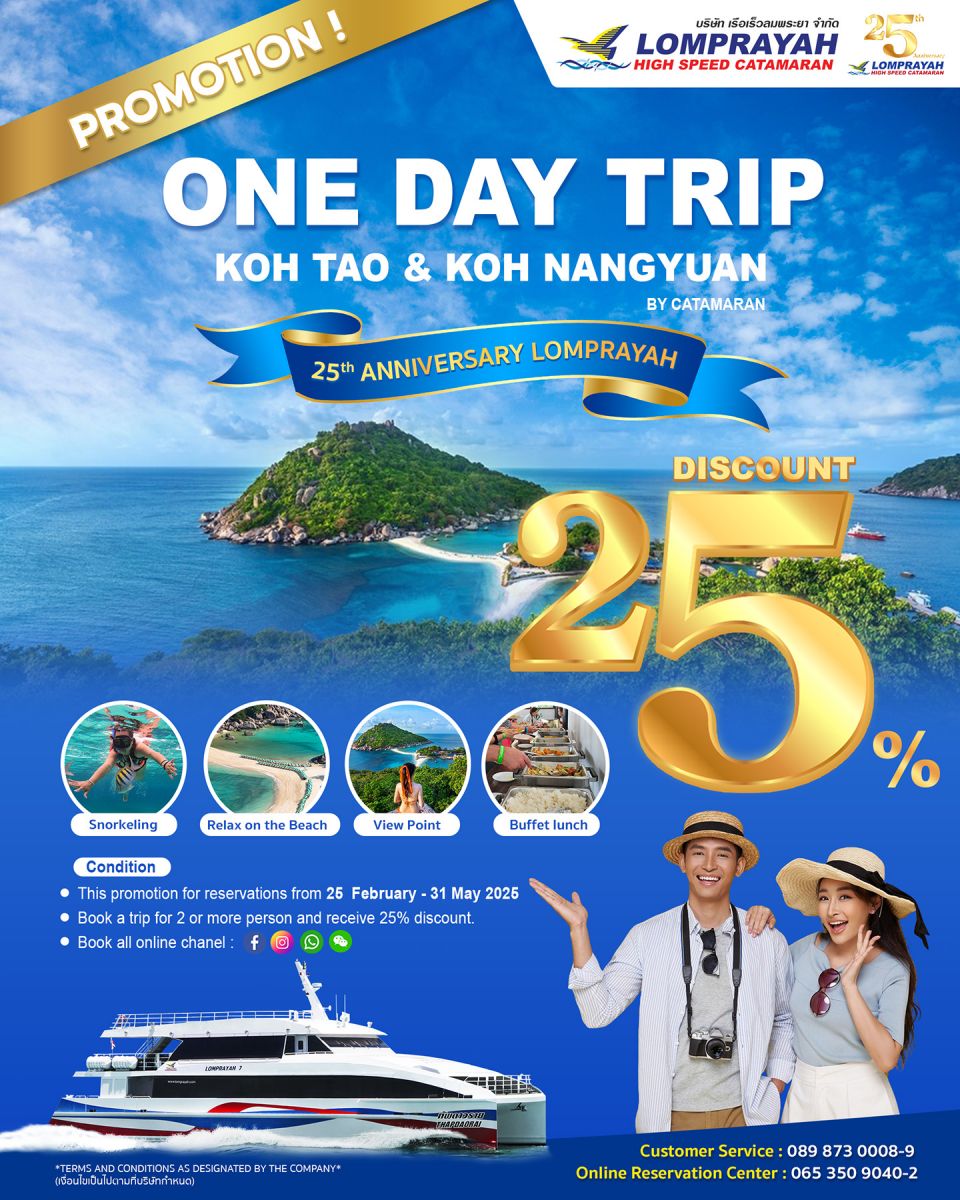 Celebating the 25th anniversary of Lomprayah High Speed Ferries Co., Ltd. with a special promotion for this summer, recieve 25 discount on Snorleling One Day Trip Koh & Koh Nangyuan (by Catamaran).